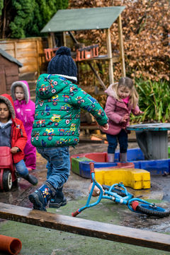 Rainbows spend most of the time outdoors and we have two fantastic play spaces outside, with opportunities for exploring art, construction and physical development or to visit our nature area with fire pit, for forest school sessions, bug hunting and gardening using natural resources, the environment and their imagination. When the weather is extreme we do have space indoors to continue our play and learning.